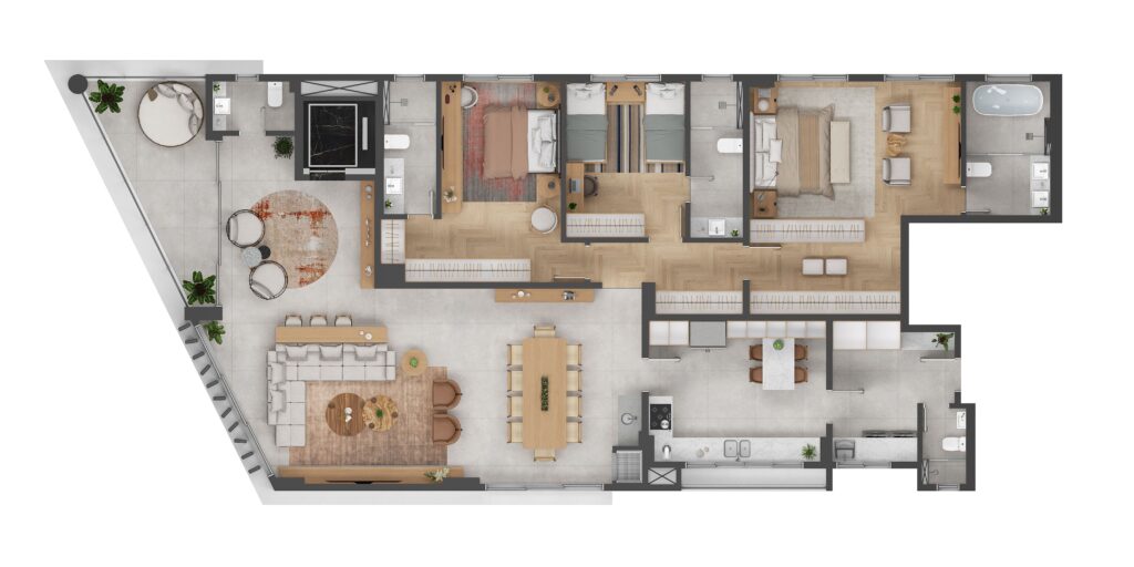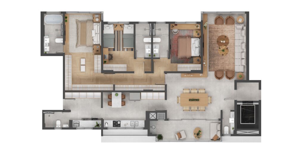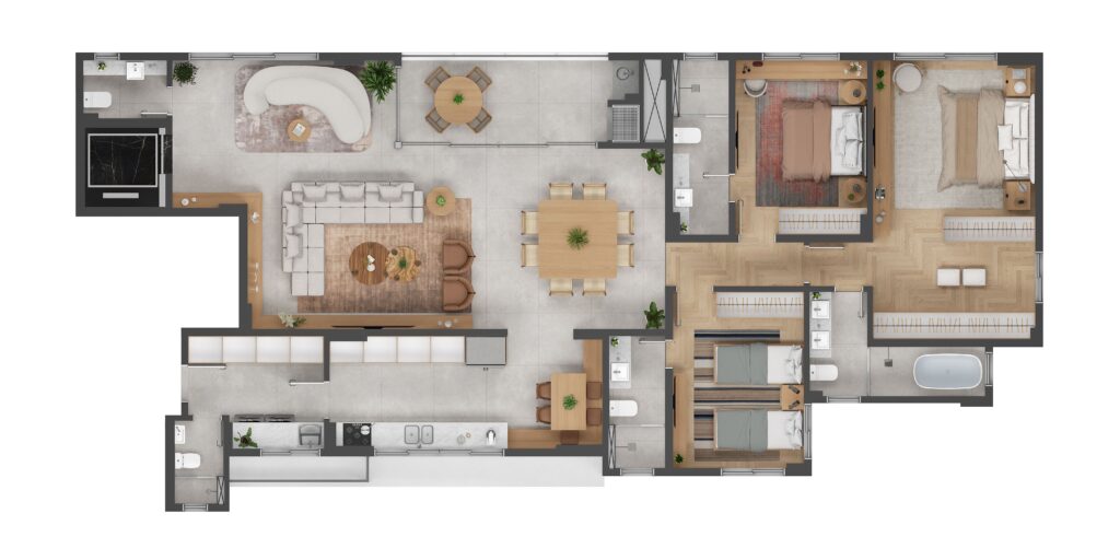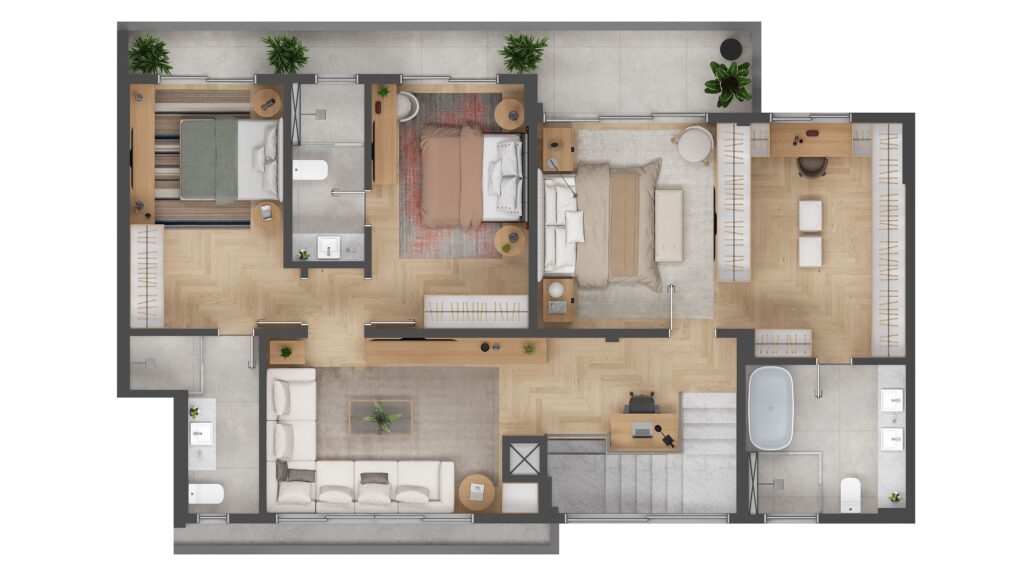 As plantas foram cuidadosamente desenhadas para proporcionar ambientes generosos, melhor aproveitamento dos espaços, conforto no dia a dia e flexibilidade para diferentes estilos de vida.